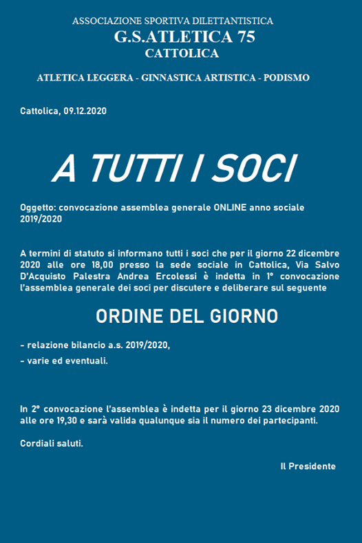 Assemblea generale soci da Massimo | Dic 22, 2020 | La Società Di seguito il link per partecipare https://meet.google.com/dkq-pjhr-yyx?fbclid=IwAR2YUsXZpiR0_kLN3yevXLXFSKSpEIQTrxX-DFmoQ0DXAp_cP-dbELanFDY